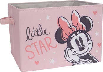 Minnie Mouse is one of Disney’s sweetest and cutest characters. This officially licensed Minnie Mouse storage basket features Minnie on a light pink background. She is 8 ½” tall, drawn in a sketchy style, and is wearing her bright pink bow. The words “little STAR” are printed in gray and pink along with white stars and pink hearts. There are two side handles for easy carrying. The storage container is 12 ½ x11” x 9”.