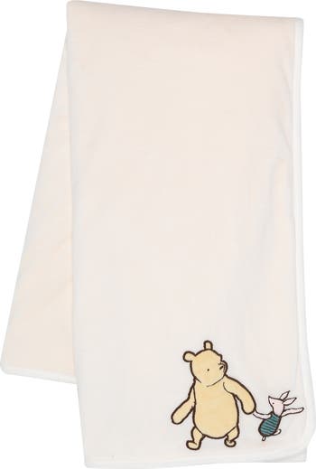 Cuddle your little one in this soft creamy white minky blanket. Disney’s lovable Classic Pooh is appliqued with his forever friend Piglet. The back of this Winnie the Pooh blanket is a luxurious white faux shearling. Sized at 30” X 40” this stroller blanket makes a great baby shower gift and is a favorite baby registry item.