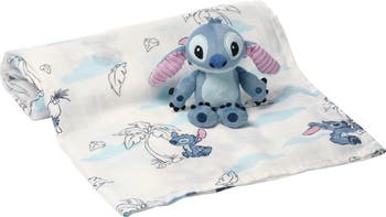 Introducing the ultimate comfort combo for your little one. This adorable duo combines the soothing power of a luxurious, ultra soft, breathable viscose swaddle blanket along with a 6 inch tall soft velour plush. The luxurious swaddle blanket is perfectly sized at 44 inches by 44 inches and is on a soft white ground with Stitch in his favorite poses along with blue clouds and palm trees. This set also includes a mini plush Stitch made in soft velour with expertly detailed embroidered features. This makes a great baby shower gift or welcome home baby gift.