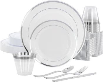 - White with Silver Trim Food Grade Plastic BPA Free Spill Free Secure Base Durable Easy to Clean Disposable 100 Dinner Plates 100 Salad Plates 100 Forks 100 Spoons 100 Knives 100 Cups
