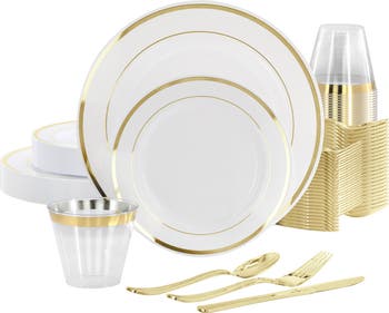 Elevate your next event with the Elama 150-Piece Disposable Plastic Dinnerware Party Set, designed to serve up to 25 guests. This elegant set features a clean and sophisticated Gold trim, offering a perfect balance of style and functionality for weddings, parties, or any special occasion. Made from high-quality food-grade plastic, each piece is BPA-free, ensuring a safe dining experience for all guests. The spill-free design and secure base ensure durability and stability, even in more lively settings, while the disposable nature makes cleaning up quick and hassle-free. The set includes 25 dinner plates, 25 salad plates, 25 9 ounce cups, 25 forks, 25 spoons and 25 knives. Whether you re hosting a formal gathering or a more casual celebration, this set combines elegance and convenience, providing everything you need for a memorable event. The Elama 150-Piece Disposable Plastic Dinnerware Party Set is the perfect solution for effortless entertaining.