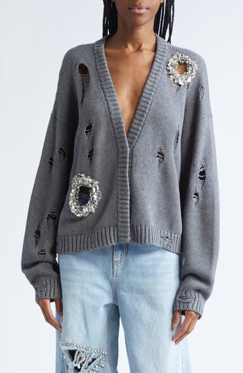 The New York label teams grunge and glamour to attention-getting effect in this cashmere-softened cotton cardigan with artful rips and threadbare holes wrapped in signature crystals.