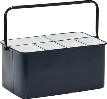 - Organize the essentials with this distressed blue and white metal storage caddy that has six compartments and a handle.
