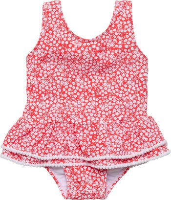 Fun and function merge just in time for beach days in this frilly one-piece featuring a sweet floral print your little one will love.