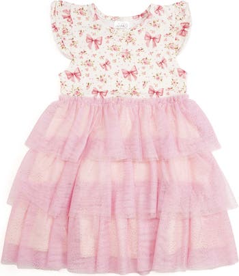- Features: Color: Ditsy floral printed cotton bodice with a pink tulle skirt overlay accented with gold glitter pin dots.