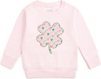 This darling pink sweatshirt features a large, charming four-leaf clover patch filled with a playful pattern of tiny shamrocks, pink bows, and golden horseshoes, making it the sweetest look for St. Patrick s Day fun!