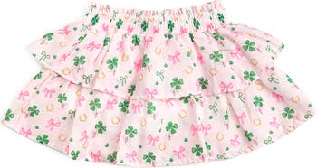 Get ready to jig and twirl in this super cute tiered skort, covered in a festive flurry of green shamrocks, pink bows, and golden horseshoes – perfect for your little leprechaun s St. Patrick s Day adventures! The comfy smocked waistband and built-in shorts let your little girl twirl and play all day long with ease.