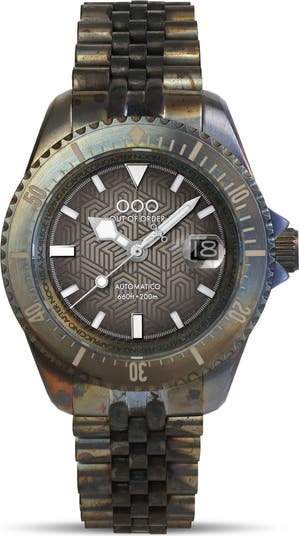 A uniquely aged bracelet and case lend an antique look to this remarkably reliable automatic watch that pays homage to the art and culture of the ancient Aztecs.
