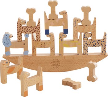 Promote fine motor skills and help develop hand-eye coordination with this beechwood balancing game featuring a collection of painted dogs and bones set upon a rocking base.