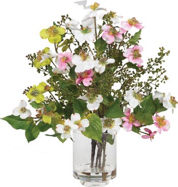 Welcome spring with open arms when you display this beautiful Dogwood arrangement. Bursting with soft, pastel colors, the delicate flowers provide the perfect cure for the winter blues. Wispy stalks with green leaves and tiny buds complete a look that will certainly freshen up any home or office. Complete with a glass vase and liquid illusion, this arrangement is sure to please.