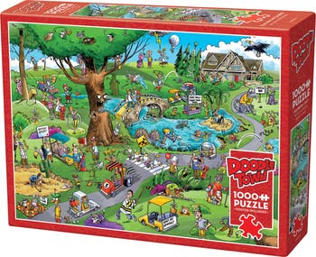 Watch out because this golf puzzle is full of punny dad jokes. And don t miss the wildlife having a tee time picnic near the sand trap, while the ducks literally cross the road instead of the chickens. This 1000 piece puzzle isn t just for fans of golf because there are too many funny antics going on to discover like the tree that eats all the golf balls, the venus fly trap, golfers getting struck by lightning, a monster frog under the bridge. But of course, it s just Par for the Course in this Doodletown puzzle. DoodleTown puzzles are full of hidden images, whimsical characters, and humorous vignettes. Illustrated by Canadian artist David Whamond Cobble Hill Doodle Town Puzzles are manufactured in the United States using the finest inks, premium grade blue board, linen paper, and the most endearing images. Our puzzles feature interesting random-shaped pieces - which are a departure from the more traditional predictable pieces found in most puzzles. No two pieces are alike. We also include a handy poster, making it easier for multiple people to work on the puzzle at the same time. We use quality linen print paper that gives the puzzle a luxurious look and feel. Not only does it look elegant, but it also works to reduce the glare by dispersing the light across the cross hatches much better than a smooth paper finish. We re environmentally friendly in that we use vegetable-based inks, and the cardboard is made from recycled material. Puzzles are sealed in shrink wrap. The box is thick and sturdy, so it can stand the test of time. The Cobble Hill Puzzle Company was founded in 2005 with a desire to bring quality puzzles with a loving, whimsical, and nostalgic feel to jigsaw puzzle enthusiasts and novices. Made in the USA.