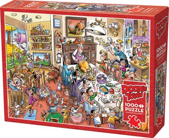 There is nothing like the chaos of Thanksgiving Togetherness. With this puzzle, you re in for 1000 pieces of pure cartoon fun as you discover the dogs, cats, and rats having their own party, while the kids outside try and catch a flying pig. Just good ol fashion fun in this Doodletown puzzle. This 1,000 piece DoodleTown puzzle is full of hidden images, whimsical characters, and humorous vignettes. Illustrated by Canadian artist David Whamond. Cobble Hill Doodle Town Puzzles are manufactured in the United States using the finest inks, premium grade blue board, linen paper, and the most endearing images. Our puzzles feature interesting random-shaped pieces - which are a departure from the more traditional predictable pieces found in most puzzles. No two pieces are alike. We also include a handy poster, making it easier for multiple people to work on the puzzle at the same time. We use quality linen print paper that gives the puzzle a luxurious look and feel. Not only does it look elegant, but it also works to reduce the glare by dispersing the light across the cross hatches much better than a smooth paper finish. We re environmentally friendly in that we use vegetable-based inks, and the cardboard is made from recycled material. Puzzles are sealed in shrink wrap. The box is thick and sturdy, so it can stand the test of time. The Cobble Hill Puzzle Company was founded in 2005 with a desire to bring quality puzzles with a loving, whimsical, and nostalgic feel to jigsaw puzzle enthusiasts and novices. Made in the USA.
