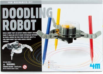 Assemble a robot artist with the 4M Doodling Robot. The 4M Doodling Robot uses vibration and spin generated by its motor to create works of art. Adjust the angle and height of the robot s colored pens and watch it work. No special tools or knowledge required; the kit contains detailed instructions and all the necessary parts. Ideal for young science enthusiasts, especially those with an interest in robotics. Requires one AA battery (not included). Recommended for ages 8 years and up.