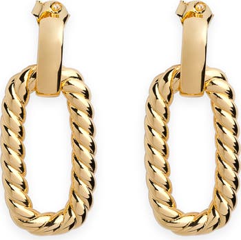 Polished twists lend contemporary appeal to door knocker drop earrings plated in high-shine 14-karat gold.