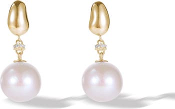 These handmade earrings feature a pair of high luster freshwater pearls that are suspended from gold vermeil/925 sterling silver studs. The pearls are a beautiful white with a delicate luster and round shape. These earrings are perfect for any occasion, from a special event to a night out.