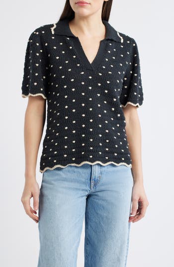 Sprinkled with celebratory dots, this textured sweater is framed by abbreviated scallop-trimmed sleeves.
