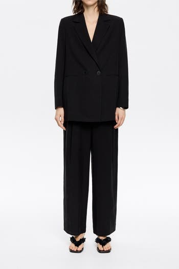Double-breasted tailored jacket with lapel neckline, long sleeves, and front buttons.