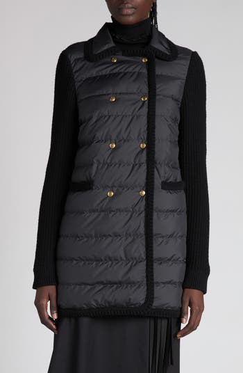 This hybrid style that s part puffer, part cardigan offers lightweight warmth in transitional weather with a combination of wool-cashmere knit back and sleeves and a down-filled front.