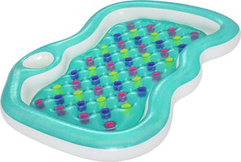 The H2OGO!® Double Designer Pool Lounge is perfect for relaxing on the water with your best friend! At over 7 feet long this lounge is nig enough for two people to enjoy together or to stretch out alone. This double lounge is the most comfortable and stylish way to have a relaxing pool day. Teal, white and colored dots - The multi-colored design and embossed texture gives this pool float a luxury feel while still adding that extra layer of comfort. Have it all at your finger tips - this lounge features a jumbo-sized storage cooler for storing drinks and other snacks while laying out in the sun. The two sturdy handles make this lounge easy to transport from the car to the water for a fun day in the sun, along with making it easier to get on and off into the pool. Elevate your pool day with the H2OGO! Double Designer Lounge! OVERVIEW: Loung Size: 7 ft. 4 in. x 5 ft. 8.5 in. (2.24 m x 1.74 m). Fits 2 Adults. Built-in cooler for holding drinks snacks. CONTENTS: 1 pool lounge, 1 repair patch.