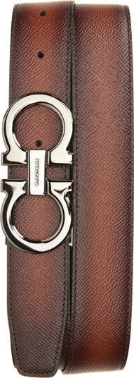 A polished double-Gancio buckle shines against richly grained calfskin on this Italian-crafted belt that doubles your styling options as it reverses between two classic colors.