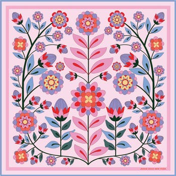 "Pink Garden" is inspired by a summer garden. The front features a pink floral design, while the back is blue, giving you more color options to match your outfit. The edges are hand-rolled and the pattern is hand-drawn and original. This silk-wool blend scarf combines the softness of silk with the warmth of wool. Lightweight yet cozy. A versatile accessory to elevate any outfit.