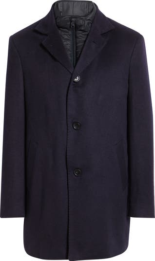 Dark-blue melton made of premium Italian cashmere brings softness and warmth to an overcoat tailored with minimal detailing for maximum versatility across your cold-weather wardrobe. A removable quilted bib in the same navy hue adds an extra layer of protection against the weather without compromising your elevated-casual style.