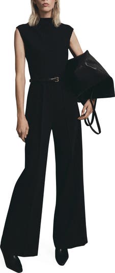 A slender faux-leather belt defines the waist of this sophisticated sleeveless jumpsuit made with a high neckline and finished with polished wide legs.