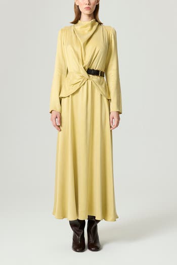 A masterclass in effortless elegance, this maxi dress features a high draped neckline and softly gathered side wrap detail that cinches at the waist with a sculptural buckle belt. Crafted in a fluid woven fabric, the A-line skirt flows gracefully to a full-length hem. Long sleeves offer added sophistication, while the concealed back zip ensures a smooth fit. Unlined for lightweight wear, it transitions seamlessly from formal soirées to refined evening plans.