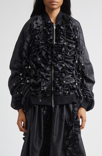 Kei Ninomiya proves his status as an avant-garde icon with this glossy satin bomber jacket that juxtaposes romantic ruffles and scores of drawcords threaded with silvery baubles—riffing off the hardware-heavy aesthetic of punk influences.