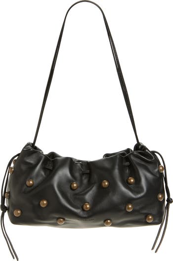 Drawstring ties are threaded through the topline of this studded calfskin-leather clutch, giving the everyday style soft, gathered dimension. It also comes with a shoulder strap that you can use to go hands-free or drape across the front.