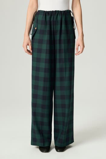 Step into standout comfort with these emerald check wide-leg pants, designed for effortless style. Cut in a relaxed silhouette with a high-rise elastic waistband and adjustable drawstring, they offer both ease and edge. The full-length drapey leg is balanced by utilitarian-inspired flap pockets with snap closures, while a front seam and mock fly elevate the tailored look. Crafted from lightweight fabric and left unlined for a fluid fall, they’re a bold alternative to everyday trousers.