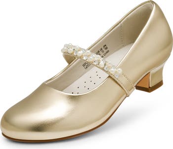 A faux pearl and rhinestone-embellished strap lends a little extra glamour to this metallic mary jane flat sized just for kids.