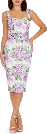 An elegant floral print and adjustable belt add visual intrigue to a figure-skimming cocktail dress fashioned with a subtle back slit for ease of movement.
