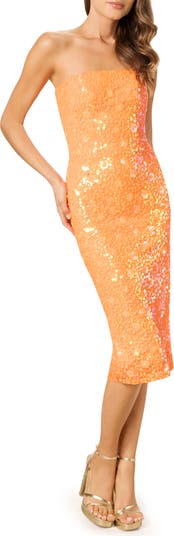 An iridescent orange hue sparkles in this sequin-studded sheath cut in a sultry strapless silhouette.