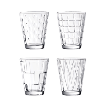 Dressed Up tumblers by Villeroy Boch add a fun, contemporary feel to your table. Sold as an assorted set of four , each tumbler has its own embossed design. Lead free crystal brings sparkle to any setting. Dishwasher safe for everyday convenience. Each Glass has a 10.5 ounce capacity