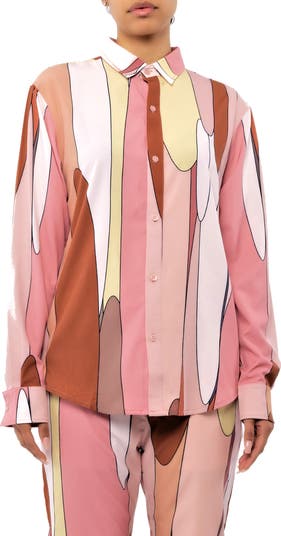 Abstract blocks of pastel drip down this button-up cut for a menswear-inspired oversized fit from a silky fabric that lends itself to polished and casual looks, alike.