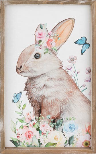Capture the enchanting spirit of spring with this framed wall sign. This piece showcases a charming bunny rabbit surrounded by a vibrant bouquet of spring flowers, bringing a touch of seasonal joy to your home. The natural wood frame adds a rustic yet elegant touch, making it a perfect addition to your Easter decor. Celebrate the season of renewal and growth with this heartwarming wall sign that captures the essence of Easter. Product Features: Decorative wooden wall sign Bunny rabbit with spring flowers design Natural wood frame has a faint whitewash finish Comes ready to hang with sawtooth hanger For indoor use only Dimensions: 15.75"H x 9.75"W x .75"D Material(s): wood/metal