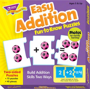 - PUT IT TOGETHER TO BUILD MATH SKILLS - This puzzle set serves as a fun introduction to addition. Fifteen different equations are presented: on one side, shown by groups of high-interest objects; on the other side, shown with numerals. Numbers represented range between 1 and 10. Supports learning standards from early-childhood professional organizations as well as national and state guidelines.