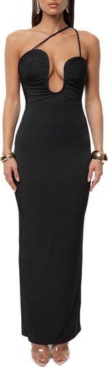 Unapologetically bold, this plunging maxi dress boasts a curve-hugging silhouette framed by adjustable, convertible straps and an alluring back slit.
