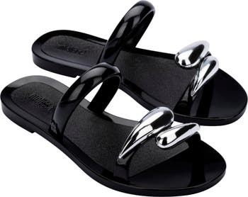 Glinting hardware and tubular straps distinguish a cushioned slide sandal designed with a water-resistant finish and infused with the brand s signature fruit scent.