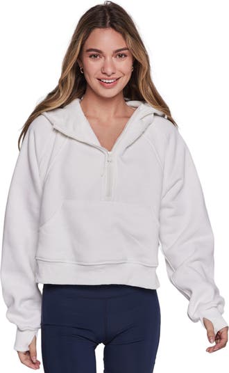 Unwind in style with our boxy half zip hoodie silhouette. It s a loungewear game changer. Wear it to and from practice. Made in our irresistibly soft fleece scuba fabric. Features a semi crop length that lands just below the waist, a funnel neck, pockets, and thumbholes.