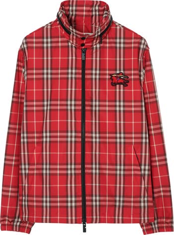 A lightweight jacket with a packaway hood, woven with the Burberry Check in seasonal crayon red. Created as part of our Year of the Horse capsule, the style is appliquéd with an Equestrian Knight Design playfully reimagining our house code in textural and metallic threads.||Press-stud and two-way zip closure|Packaway drawcord hood|Drawcord waist|Side zip pockets|Elasticated cuffs|Comes with a garment bag