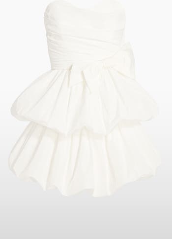 Chic and playful, this strapless bridal mini dress features a softly structured bodice that flows into a voluminous bubble skirt. A sculptural bow at the waist accentuates the silhouette, adding a touch of romance to its modern proportions. The clean lines and airy texture create an effortlessly feminine statement.