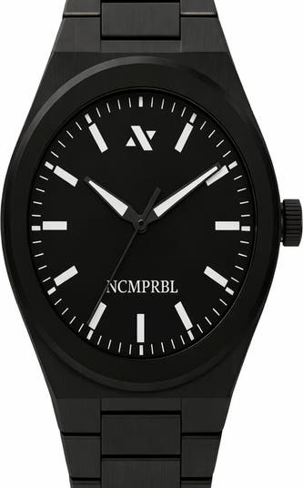 Elevate Link Phantom 42MM Mens Watch in Matte Black and Silver—the ultimate timepiece to complete any silent luxury look in your wardrobe. This all black 42mm limited release timepiece is designed for those who lead with restraint, offers an illuminated dial providing night-time visibility, and a brushed matte black tri-link metal bracelet strap.