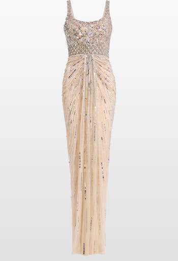 Gasp-worthy glamour, this gown blends vintage-inspired charm with modern elegance. The fitted bodice, framed by wide straps and a flattering scoop neckline, shimmers with intricate sequins and beads that catch the light from every angle. Soft draping at the waist flows into a fluid, gathered skirt, creating graceful movement and an elongated, statuesque silhouette. A captivating choice for evenings that call for timeless sophistication and a touch of drama.