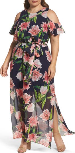 Vibrant flowers keep things fresh and bright on a flowing maxi dress with cold-shoulder cutouts and a flattering tie at the waist.