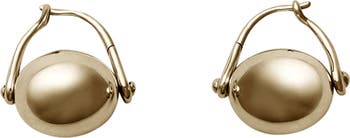 These sleek, minimalist ellipse earrings features a delicate spinning design with a smooth, polished orb setting for a look inspired by Scandinavian Modernist art.