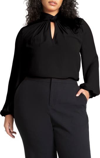 A twist at the neck creates soft gathers to frame the cutout of this popover top with voluminous blouson sleeves.