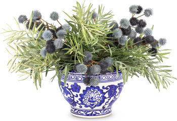 Charming and natural, the Elowen Thistle Toile Bowl Arrangement features rounded blue thistle and luxuriant greenery, carefully arranged to create a balanced and organic aesthetic. Set in a beautifully detailed toile bowl, this arrangement brings a timeless, rustic appeal to any space, offering a harmonious blend of nature and elegance. A lasting luxury, timeless and unrivaled.