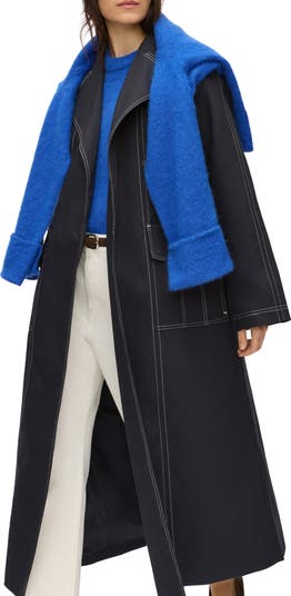 Contrast topstitching traces the classic details of an organic cotton trench coat offered in a navy blue hue.